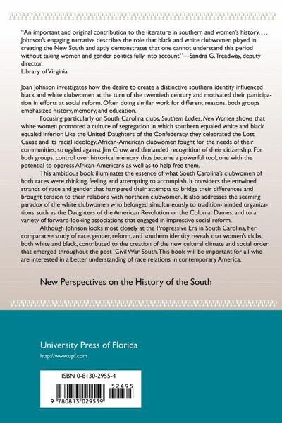 Joan Marie Johnson investigates how the desire to create a distinctive southern identity influenced black and white clubwomen at the turn of the 20th century and motivated their participation in efforts at social reform. Often doing similar work for different reasons, both groups emphasized history, memory, and education. Focusing particularly on South Carolina clubs, Southern Ladies, New Women shows that white women promoted a culture of segregation in which southern equaled white and black equaled inferior.