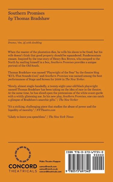 Drama / Characters: 6m, 2f, with doubling / Simple Set / When the master of the plantation dies, he wills his slaves to be freed, but his wife doesn't think that good property should be squandered. Pandemonium ensues. The play is inspired by the true story of Henry Box Brown who escaped to the north by mailing himself in a box. Southern Promises provides a unique portrait of the old south. Bradshaw was named Playwright of the year by the theater blog KUL-That Sounds Cool and Southern Promises wa
