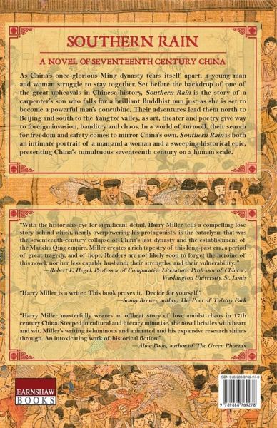 As China's once-glorious Ming dynasty tears itself apart, a young man and woman struggle to stay together. Set before the backdrop of one of the great upheavals in Chinese history, Southern Rain is the story of a carpenter's son who falls for a brilliant Buddhist nun just as she is set to become a powerful man's concubine. Their adventures lead them north to Beijing and south to the Yangtze valley, as art, theater and poetry give way to foreign invasion, banditry and chaos. In a world of turmoil, their search for freedom and safety comes to mirror China's own. Southern Rain is both an intimate portrait of a man and a woman and a sweeping historical epic, presenting China's tumultuous seventeenth century on a human scale.