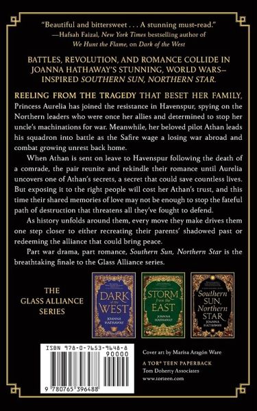 Battles, revolution, and romance collide in Southern Sun, Northern Star, the conclusion to Joanna Hathaway's stunning, World Wars-inspired fantasy series. Reeling from the tragedy that beset her family, Princess Aurelia has joined the resistance in Havenspur, spying on the Northern leaders who were once her allies and determined to stop her uncle's machinations for war. Meanwhile, her beloved pilot Athan leads his squadron into battle as the Safire wage a losing war abroad and combat growing unrest back home. When Athan is sent on leave to Havenspur following the death of a comrade, the pair reunite and rekindle their romance until Aurelia uncovers one of Athan's secrets, a secret that could save countless lives. But exposing it to the right people will cost her Athan's trust, and this time, their shared memories of love might not be enough to stop the fateful path of destruction that threatens all they've fought to defend. As history unfolds around them, every move they make drives them one step closer to either recreating their parents' shadowed past or redeeming the alliance that could bring peace. The breathtaking finale to a legendary series. Part war drama, part romance, Southern Sun, Northern Star is the epic conclusion to the Glass Alliance series.