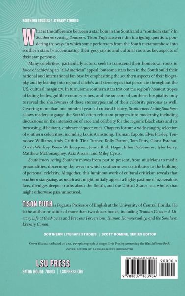 What is the difference between a star born in the South and a "southern star"? In Southerners Acting Southern, Tison Pugh answers this intriguing question, pondering the ways in which some performers from the South metamorphose into southern stars by accentuating their geographic and cultural roots as key aspects of their star personas. Many celebrities, particularly actors, seek to transcend their hometown roots in favor of achieving an "all-American" appeal, but some stars born in the South build their national and international fan base by emphasizing the southern aspects of their biography and by leaning into regional clichés and stereotypes that percolate throughout the U.S. cultural imaginary. In turn, some southern stars trot out the region's hoariest tropes of fading belles, gullible country rubes, and the succors of southern hospitality only to reveal the shallowness of these stereotypes and of their celebrity personas as well. Covering more than one hundred years of cultural history, Southerners Acting Southern allows readers to gauge the South's often-reluctant progress into modernity, including discussions on the intersection of race and celebrity for the region's Black stars and its increasing, if hesitant, embrace of queer ones. Chapters feature a wide-ranging selection of southern celebrities, including Louis Armstrong, Truman Capote, Elvis Presley, Tennessee Williams, Andy Griffith, Tina Turner, Dolly Parton, Tom Petty, Gloria Estefan, Oprah Winfrey, Reese Witherspoon, Jenna Bush Hager, Ellen DeGeneres, Tyler Perry, Matthew McConaughey, Aziz Ansari, and Miley Cyrus. Southerners Acting Southern moves from past to present, from musicians to media personalities, discerning the ways in which southernness contributes to the building of personal celebrity. Altogether, this luminous work of cultural criticism reveals that southern stargazing, as much as it might initially appear a flighty pastime of overzealous fans, divulges deeper truths about the South, and the United States as a whole, that might otherwise pass unnoticed.