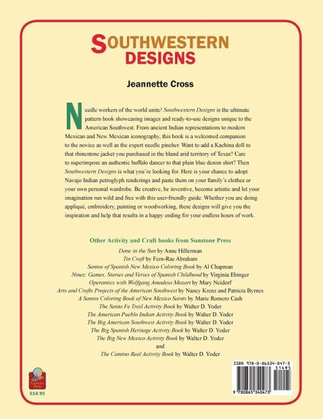 Needle workers of the world unite! "Southwestern Designs" is the ultimate pattern book showcasing images and ready-to-use designs unique to the American Southwest. From ancient Indian representations to modern Mexican and New Mexican iconography, this book is a welcomed companion to the novice as well as the expert needle pincher. Want to add a Kachina doll to that rhinestone jacket you purchased in the bland arid territory of Texas? Care to superimpose an authentic buffalo dancer to that plain blue denim shirt? Then "Southwestern Designs" is what you're looking for. Here is your chance to adopt Navajo Indian petroglyph renderings and paste them on your family's clothes or your own personal wardrobe. Be creative, be inventive, become artistic and let your imagination run wild and free with this user-friendly guide. Whether you are doing appliqué, embroidery, painting or woodworking, these designs will give you the inspiration and help that results in a happy ending for your endless hours of work.