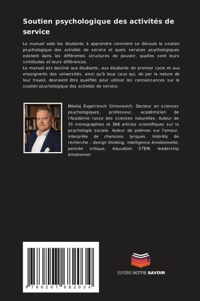 Le manuel aide les étudiants à apprendre comment se déroule le soutien psychologique des activités de service et quels services psychologiques existent dans les différentes structures de pouvoir, quelles sont leurs similitudes et leurs différences.Le manuel est destiné aux étudiants, aux étudiants de premier cycle et aux enseignants des universités, ainsi qu'à tous ceux qui, de par la nature de leur travail, devraient être qualifiés pour utiliser les connaissances sur le soutien psychologique des activités de service.