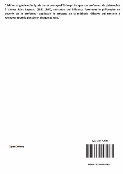 " Édition originale et intégrale de cet ouvrage d'Alain qui évoque son professeur de philosophie à Vanves Jules Lagneau (1851-1894), rencontre qui influença fortement le philosophe en devenir car le professeur appliquait le précepte de la méthode réflexive qui consiste à retrouver toute la pensée en chaque pensée."