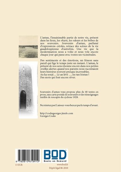 Souvenirs d'antan brosse des scènes de la vie quotidienne guadeloupéenne, au fil du temps du 19 ème siècle jusqu'à l'aube du 20 ème. Parfumé d'expressions créoles et d'une prose très précise, le lecteur entreprend un voyage qui le conduit vers les sentiers de sa jeunesse.On y trouve des témoignages de rescapés du cyclone 1928 qui a ravagé l'île à l'époque.Un livre à lire absolument en famille ou seul, une mémoire pour la nouvelle génération.