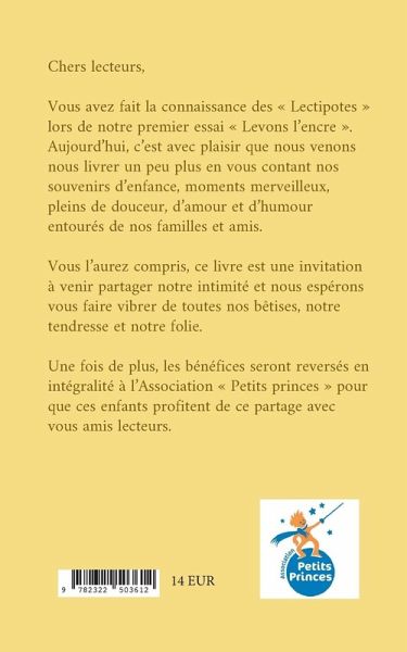Lors du premier tome, les Lectipotes ont "levé l'encre". Dans ce tome 2, ils viennent vous conter leurs souvenirs d'enfance, moments merveilleux, pleins de douceur, d'amour et d'humour, entourés de leurs familles et amis.Ce livre, débordant d'anecdotes savoureuses, est une invitation à partager leurs bêtises, leur tendresse et leurs joies.Tous les bénéfices seront reversés à l'"Association Petits princes" pour que ces enfants profitent de ce partage avec vous, amis lecteurs.
