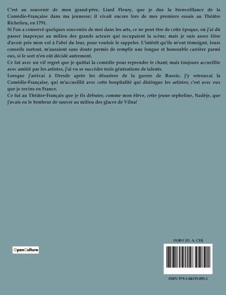 C'est au souvenir de mon grand-père, Liard Fleury, que je dus la bienveillance de la Comédie-Française dans ma jeunesse; il vivait encore lors de mes premiers essais au Théâtre Richelieu, en 1791. Si l'on a conservé quelques souvenirs de moi dans les arts, ce ne peut être de cette époque, où j'ai dû passer inaperçue au milieu des grands acteurs qui occupaient la scène; mais je suis assez fière d'avoir pris mon vol à l'abri du leur, pour vouloir le rappeler. L'intérêt qu'ils m'ont témoigné, leurs conseils surtout, m'auraient sans doute permis de remplir une longue et honorable carrière parmi eux, si le sort n'en eût décidé autrement. Ce fut avec un vif regret que je quittai la comédie pour reprendre le chant; mais toujours accueillie avec amitié par les artistes, j'ai vu se succéder trois générations de talents. Lorsque j'arrivai à Dresde après les désastres de la guerre de Russie, j'y retrouvai la Comédie-Française, qui m'accueillit avec cette hospitalité qui distingue les artistes; c'est avec eux que je revins en France. Ce fut au Théâtre-Français que je fis débuter, comme mon élève, cette jeune orpheline, Nadèje, que j'avais eu le bonheur de sauver au milieu des glaces de Vilna!