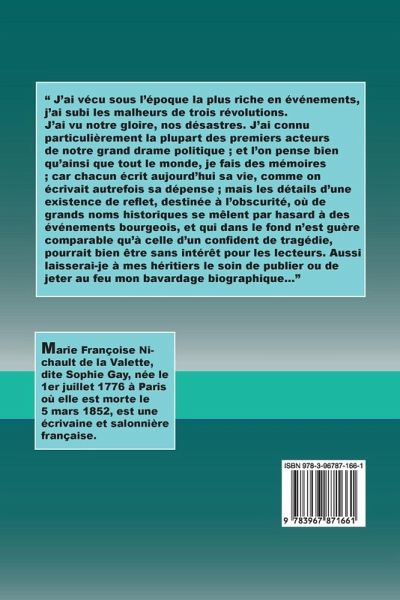 " J'ai vécu sous l'époque la plus riche en événements, j'ai subi les malheurs de trois révolutions. J'ai vu notre gloire, nos désastres. J'ai connu particulièrement la plupart des premiers acteurs de notre grand drame politique ; et l'on pense bien qu'ainsi que tout le monde, je fais des mémoires ; car chacun écrit aujourd'hui sa vie, comme on écrivait autrefois sa dépense ; mais les détails d'une existence de reflet, destinée à l'obscurité, où de grands noms historiques se mêlent par hasard à des événements bourgeois, et qui dans le fond n'est guère comparable qu'à celle d'un confident de tragédie, pourrait bien être sans intérêt pour les lecteurs. Aussi laisserai-je à mes héritiers le soin de publier ou de jeter au feu mon bavardage biographique..."