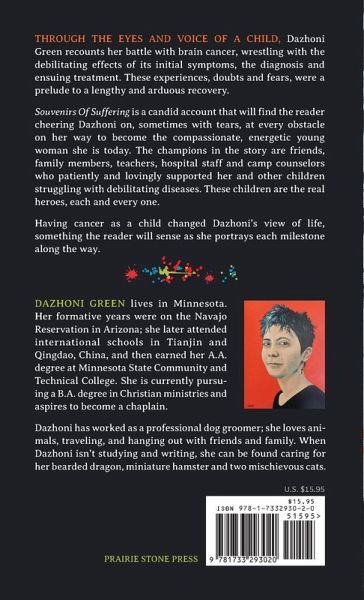 Through the eyes and voice of a child, Dazhoni Green recounts her battle with brain cancer, wrestling with the debilitating effects of its initial symptoms, the diagnosis and ensuing treatment. These experiences, doubts and fears, were a prelude to a lengthy and arduous recovery. SOUVENIRS OF SUFFERING is a candid account that will find the reader cheering Dazhoni on, sometimes with tears, at every obstacle on her way to become the compassionate, energetic young woman she is today. The champions in the story are friends, family members, teachers, hospital staff and camp counselors who patiently and lovingly supported her and other children struggling with debilitating diseases. These children are the real heroes, each and every one. Having cancer as a child changed Dazhoni's view of life, something the reader will sense as she portrays each milestone along the way.