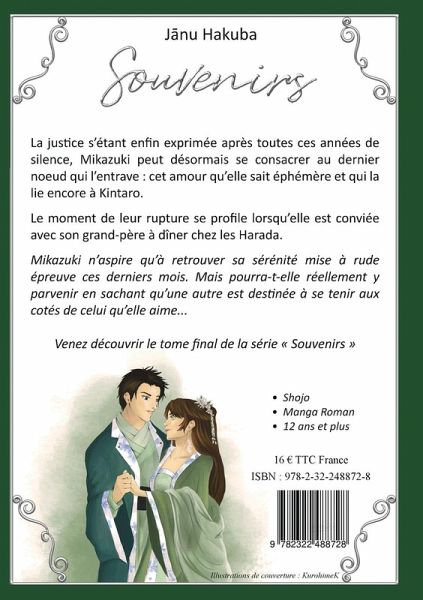 La justice s'étant enfin exprimée après toutes ces années de silence, Mikazuki peut désormais se consacrer au dernier noeud qui l'entrave : cet amour qu'elle sait éphémère et qui la lie encore à Kintaro.Le moment de leur rupture se profile lorsqu'elle est conviée avec son grand-père à dîner chez les Harada.Mikazuki n'aspire qu'à retrouver sa sérénité mise à rude épreuve ces derniers mois. Mais pourra-t-elle réellement y parvenir en sachant qu'une autre est destinée à se tenir aux côtés de celui qu'elle aime...Venez découvrir sans attendre le tome final de la série "Souvenirs"