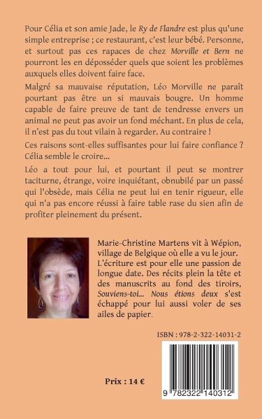 Pour Célia et son amie Jade, le Ry de Flandre est plus qu'une simple entreprise ; ce restaurant, c'est leur bébé. Personne, et surtout pas ces rapaces de chez Morville et Bern ne pourront les en déposséder quels que soient les problèmes auxquels elles doivent faire face.Malgré sa mauvaise réputation, Léo Morville ne paraît pourtant pas être un si mauvais bougre. Un homme capable de faire preuve de tant de tendresse envers un animal ne peut pas avoir un fond méchant. En plus de cela, il n'est pas du tout vilain à regarder. Au contraire !Ces raisons sont-elles suffisantes pour lui faire confiance ? Célia semble le croire...Léo a tout pour lui, et pourtant il peut se montrer taciturne, étrange, voire inquiétant, obnubilé par un passé qui l'obsède, mais Célia ne peut lui en tenir rigueur, elle qui n'a pas encore réussi à faire table rase du sien afin de profiter pleinement du présent.Souviens-toi... Nous étions deux est une symphonie où se mêlent douceur, amour, passion et émotions, mais aussi force, détermination et l'envie d'exister.Ce roman touchant ravira votre esprit et vos papilles "imaginaires".