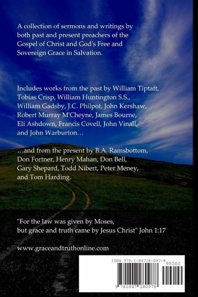 Collected writings from both past and present preachers of God's Gospel of Free and Sovereign Grace through Jesus Christ. Includes works by William Tiptaft, Tobias Crisp, William Huntington, William Gadsby, Robert Murray M'Cheyne, J.C. Philpot, John Kershaw, James Bourne, Eli Ashdown, Francis Covell, John Vinall, John Warburton, Don Fortner, Henry Mahan, Don Bell, Gary Shepard, Todd Nibert, Tom Harding, Peter Meney and Benjamin A. Ramsbottom. The book also includes an Introduction on 'Sovereign Grace', background information about each author and a useful appendix containing much information about other works written by or about the authors. These works are by authors whose lives span several hundred years, yet their message is the same - they proclaim the grace of God which brings salvation - because the One of whom they speak never changes, He is "Jesus Christ, the same yesterday, and to day, and for ever".