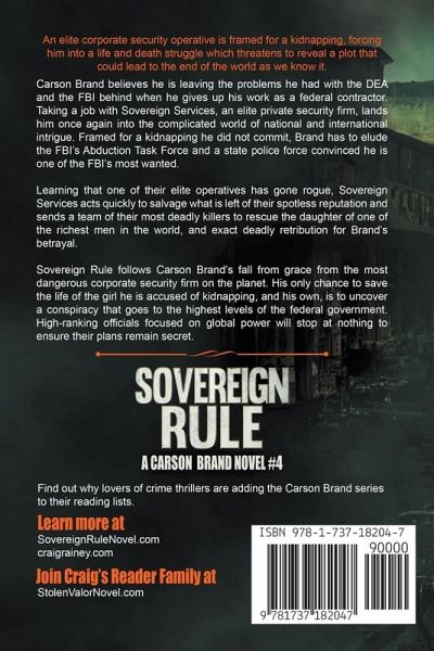 Sovereign Rule - A Carson Brand Novel #4 thrusts Carson Brand into a deadly game of survival and conspiracy, where the consequences reach far beyond his own fate. After walking away from his life as a federal contractor, Brand believes his problems with the DEA and FBI are behind him. But his new job with Sovereign Services, an elite corporate security firm, quickly pulls him back into a world of international intrigue and danger. Framed for the kidnapping of a powerful billionaire's daughter, Brand becomes the target of the FBI's Abduction Task Force and a relentless state police force, both convinced he's one of America's most wanted criminals. To make matters worse, his own employer-Sovereign Services-believes he's gone rogue, and they're willing to sacrifice everything to protect their reputation. Brand now faces a team of the firm's deadliest operatives, dispatched to eliminate him and "rescue" the girl he never abducted. As the walls close in, Brand must race to uncover the truth behind the kidnapping and expose a shadowy conspiracy that extends to the highest levels of government. Powerful elites with global ambitions will stop at nothing to keep their sinister plans hidden, even if it means silencing Brand forever. In Sovereign Rule, Carson Brand faces his most dangerous challenge yet-a life-and-death struggle that could unravel a plot capable of changing the world order as we know it. With relentless action and high-stakes intrigue, this explosive thriller will keep crime fiction fans hooked from start to finish.