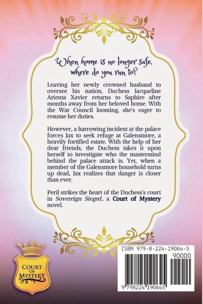 When home is no longer safe, where do you run to? Leaving behind her newly crowned husband to oversee Pettraud, Duchess Jacqueline Arienta Xavier returns home to Saphire for the first time in months. While the War Council looms ever closer, the Duchess is eager to get back to work upon her return to the duchy. Yet, soon after her homecoming, a harrowing attack within the halls of the palace forces Jax to flee from court. Seeking refuge behind the walls of the fortified Galensmore estate, Jax and her friends prepare to wait out the storm until the culprit behind the palace attack is apprehended. It's not until a member of the Galensmore household turns up dead that Jax realizes danger is closer than ever before. Peril strikes the heart of Duchess Jacqueline's court in Sovereign Sieged. Discover more of Duchess Jacqueline's adventures in the Court of Mystery, an enchanting series full of fantastical intrigue.