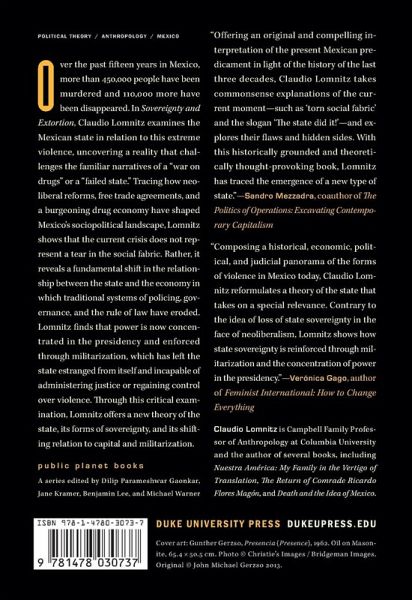 Over the past fifteen years in Mexico, more than 450,000 people have been murdered and 110,000 more have been disappeared. In Sovereignty and Extortion, Claudio Lomnitz examines the Mexican state in relation to this extreme violence, uncovering a reality that challenges the familiar narratives of "a war on drugs" or a "failed state." Tracing how neoliberal reforms, free trade agreements, and a burgeoning drug economy have shaped Mexico's sociopolitical landscape, Lomnitz shows that the current crisis does not represent a tear in the social fabric. Rather, it reveals a fundamental shift in the relationship between the state and the economy in which traditional systems of policing, governance, and the rule of law have eroded. Lomnitz finds that power is now concentrated in the presidency and enforced through militarization, which has left the state estranged from itself and incapable of administering justice or regaining control over violence. Through this critical examination, Lomnitz offers a new theory of the state, its forms of sovereignty, and its shifting relation to capital and militarization.
