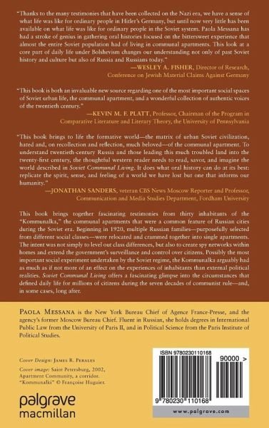"Thanks to the many testimonies that have been collected on the Nazi era, we have a sense of what life was like for ordinary people in Hitler s Germany, but until now very little has been available on what life was like for ordinary people in the Soviet system. Paola Messana has had a stroke of genius in gathering oral histories focused on the bittersweet experience that almost the entire Soviet population had of living in communal apartments. This look at a core part of daily life under Bolshevism changes our understanding not only of past Soviet history and culture but also of Russia and Russians today." - Wesley A. Fisher, Director of Research, Conference on Jewish Material Claims Against Germany"This book is both an invaluable new source regarding one of the most important social spaces of Soviet urban life, the communal apartment, and a wonderful collection of authentic voices of the twentieth century." - Kevin M. F. Platt, Professor, Chairman of the Program in Comparative Literature and Literary Theory, the University of Pennsylvania"This book brings to life the formative world - the matrix of urban soviet civilization, hated and, on recollection and reflection, much beloved - of the communal apartment. To understand twentieth-century Russia and those leading this much troubled land into the twenty-first century, the thoughtful western reader needs to read, savor, and imagine the world described in Soviet Communal Living. It does what oral history can do at its best:replicate the spirit, sense, and feeling of a world we have lost but one that informs our humanity." - Jonathan Sanders, veteran CBS News Moscow Reporter and Professor, Communication and Media Studies Department, Fordham University