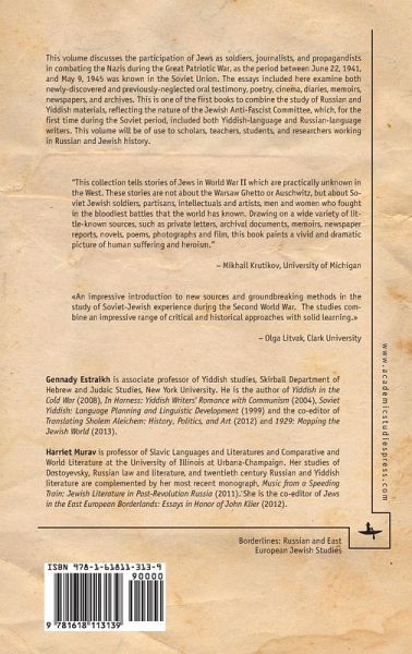 This volume discusses the participation of Jews as soldiers, journalists, and propagandists in combating the Nazis during the Great Patriotic War, as the period between June 22, 1941, and May 9, 1945 was known in the Soviet Union. The essays included here examine both newly-discovered and previously-neglected oral testimony, poetry, cinema, diaries, memoirs, newspapers, and archives. This is one of the first books to combine the study of Russian and Yiddish materials, reflecting the nature of the Jewish Anti-Fascist Committee, which, for the first time during the Soviet period, included both Yiddish-language and Russian-language writers. This volume will be of use to scholars, teachers, students, and researchers working in Russian and Jewish history.