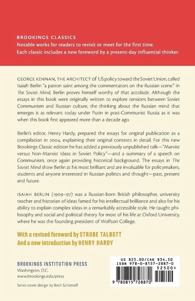 "With a revised foreword by Brookings President Strobe Talbott and a new introduction by Berlin’s editor, Henry Hardy. George Kennan, the architect of US policy toward the Soviet Union, called Isaiah Berlin the patron saint among the commentators of the Russian scene.” In The Soviet Mind, Berlin proves himself fully worthy of that accolade. Although the essays in this book were originally written to explore the tensions between Soviet communism and Russian culture, the thinking about the Russian mind that emerges is as relevant today under Putin’s post-communist Russia as it was when this book first appeared more than a decade ago. This Brookings Classic brings together Berlin’s writings about the Soviet Union. Among the highlights are accounts of Berlin’s meetings with the Russian writers in the aftermath of the war; a celebrated memorandum he wrote for the British Foreign Office in 1945 about the state of the arts under Stalin; Berlin’s account of Stalin’s manipulative artificial dialectic”; portraits of Pasternak and poet Osip Mandel'shtam; Berlin’s survey of Russian culture based on a visit in 1956; and a postscript reflecting on the fall of the Berlin Wall and other events in 1989. Henry Hardy prepared the essays for publication; his introductory discussions describe their history. In his foreword, revised for this new edition, Brookings’s Strobe Talbott, a long-time expert on Russia and the Soviet Union, relates the essays to Berlin’s other work. The essays and other pieces in The Soviet Mindwhich includes a new essay, Marxist versus Non-Marxist Ideas in Soviet Policy”, and a summary of a talk on communismrepresent Berlin at his most brilliant, and are invaluable for policy-makers, students and anyone interested in Russian politics and thoughtpast, present and future."