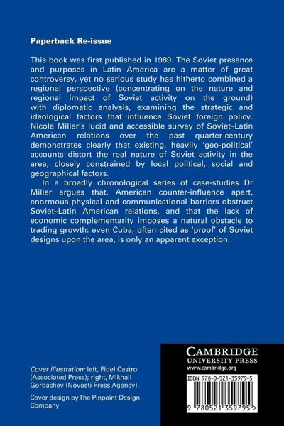 This book was first published in 1989. The Soviet presence and purposes in Latin America are a matter of great controversy, yet no serious study was hitherto combined with a regional perspective (concentrating on the nature and regional impact of Soviet activity on the ground) and diplomatic analysis, examining the strategic and ideological factors that influence Soviet foreign policy. Nicola Miller's lucid and accessible survey of Soviet-Latin American relations over the past quarter-century demonstrates clearly that existing, heavily 'geo-political' accounts distort the real nature of Soviet activity in the area, closely constrained by local political, social and geographical factors. In a broadly chronological series of case-studies Dr Miller argues that, American counter-influence apart, enormous physical and communicational barriers obstruct Soviet-Latin American relations and that the lack of economic complementarity imposes a natural obstacle to trading growth: even Cuba, often cited as 'proof' of Soviet designs upon the area, is only an apparent exception.