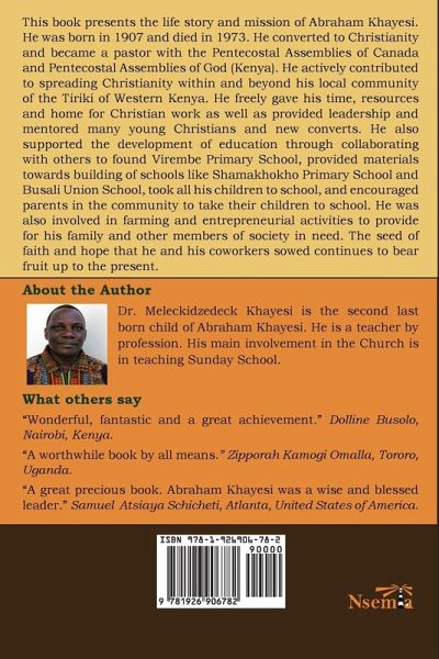 This book presents the life story and mission of Abraham Khayesi. Born in 1907, he died in 1973 following a rich life of experience and accomplishments. In that life, Abraham converted to Christianity, becoming a pastor with the Pentecostal Assemblies of Canada and Pentecostal Assemblies of God (Kenya). He actively contributed to spreading Christianity within and beyond his local community of the Tiriki of Western Kenya. In the course of his work, he freely gave his time, resources and home for Christian work. This is in addition to providing leadership and mentoring many young Christians and new converts. He also supported the development of education through collaborating with others to found Virembe Primary School, provided materials towards the building of schools like Shamakhokho Primary School and Busali Union School. In the process, he ensured all his children went to school and encouraged parents in the community to take their children to school. Abraham was also involved in farming and entrepreneurial activities to provide for his family and other members of society in need. The seed of faith and hope that he and his coworkers sowed continues to bear fruit up to the present.