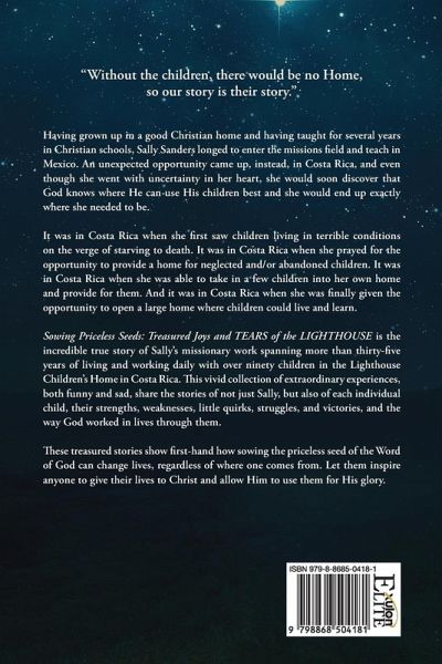 "Without the children, there would be no Home, so our story is their story." Having grown up in a good Christian home and having taught for several years in Christian schools, Sally Sanders longed to enter the missions field and teach in Mexico. An unexpected opportunity came up, instead, in Costa Rica, and even though she went with uncertainty in her heart, she would soon discover that God knows where He can use His children best and she would end up exactly where she needed to be. It was in Costa Rica when she first saw children living in terrible conditions on the verge of starving to death. It was in Costa Rica when she prayed for the opportunity to provide a home for neglected and/or abandoned children. It was in Costa Rica when she was able to take in a few children into her own home and provide for them. And it was in Costa Rica when she was finally given the opportunity to open a large home where children could live and learn. Sowing Priceless Seeds: Treasured Joys and TEARS of the LIGHTHOUSE is the incredible true story of Sally's missionary work spanning more than thirty-five years of living and working daily with over ninety children in the Lighthouse Children's Home in Costa Rica. This vivid collection of extraordinary experiences, both funny and sad, share the stories of not just Sally, but also of each individual child, their strengths, weaknesses, little quirks, struggles, and victories, and the way God worked in lives through them. These treasured stories show first-hand how sowing the priceless seed of the Word of God can change lives, regardless of where one comes from. Let them inspire anyone to give their lives to Christ and allow Him to use them for His glory.