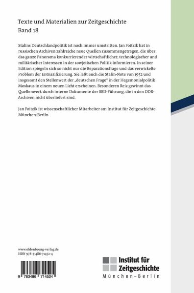 stalins Deutschlandpolitik ist noch immer umstritten. Jan Foitzik hat in russischen Archiven zahlreiche neue Quellen zusammengetragen, die über das ganze Panorama konkurrierender wirtschaftlicher, technologischer und militärischer Interessen in der sowjetischen Politik informieren. In seiner Edition spiegeln sich so nicht nur die Reparationsfrage und das verwickelte Problem der Entnazifizierung. Sie lässt auch die Stalin-Note von 1952 und insgesamt den Stellenwert der "deutschen Frage" in der Hegemonialpolitik Moskaus in einem neuen Licht erscheinen. Besonderen Reiz gewinnt das Quellenwerk durch interne Dokumente der SED-Führung, die in den DDR-Archiven nicht überliefert sind.