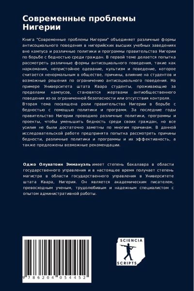 Kniga "Sowremennye problemy Nigerii" ob#edinqet razlichnye formy antisocial'nogo powedeniq w nigerijskih wysshih uchebnyh zawedeniqh wne kampusa i razlichnye politiki i programmy prawitel'stwa Nigerii po bor'be s bednost'ü sredi grazhdan. V perwoj teme delaetsq popytka rassmotret' razlichnye formy antisocial'nogo powedeniq, takie kak narkomaniq, nepristojnoe odewanie, kul'tizm i powedenie, kotoroe schitaetsq nenormal'nym w obschestwe, prichiny, wliqnie na studentow i wozmozhnye resheniq po ogranicheniü antisocial'nogo powedeniq. Na primere Uniwersiteta shtata Kwara studenty, prozhiwaüschie za predelami kampusow, stanowqtsq zhertwami antiobschestwennogo powedeniq iz-za ogranichennoj bezopasnosti ili otsutstwiq kontrolq.Vtoraq tema poswqschena roli prawitel'stwa Nigerii w bor'be s bednost'ü s pomosch'ü politiki i programm. Za poslednie gody prawitel'stwo Nigerii prowodilo razlichnye politiki, programmy i proekty, chtoby umen'shit' bednost' sredi swoih grazhdan, no wse usiliq ne byli dostatochno zametny po mnogim prichinam. V dannoj issledowatel'skoj rabote predprinqta popytka rassmotret' prichiny bednosti, razlichnye politiki i programmy i ih äffektiwnost', a takzhe predlozheny wozmozhnye rekomendacii.