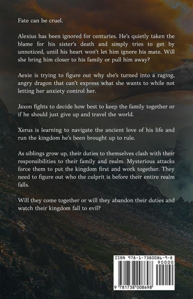 Fate can be cruel. Alexius has been ignored for centuries. He's quietly taken the blame for his sister's death and simply tries to get by unnoticed, until his heart won't let him ignore his mate. Will she bring him closer to his family or pull him away? Aexie is trying to figure out why she's turned into a raging, angry dragon that can't express what she wants to while not letting her anxiety control her. Jaxon fights to decide how best to keep the family together or if he should just give up and travel the world. Xerus is learning to navigate the ancient love of his life and run the kingdom he's been brought up to rule. As siblings grow up, their duties to themselves clash with their responsibilities to their family and realm. Mysterious attacks force them to put the kingdom first and work together. They need to figure out who the culprit is before their entire realm falls. Will they come together or will they abandon their duties and watch their kingdom fall to evil?
