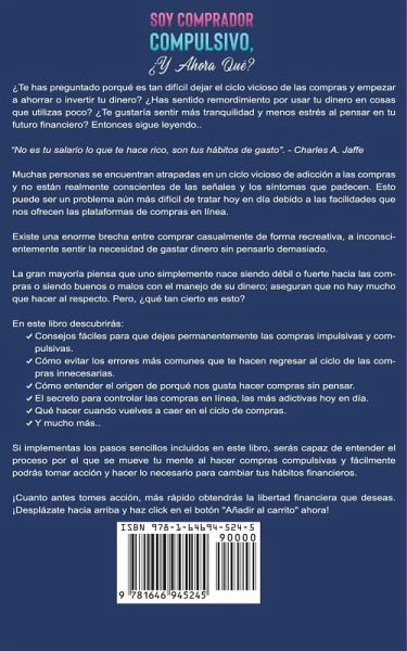 ¿Te has preguntado porqué es tan difícil dejar el ciclo vicioso de las compras y empezar a ahorrar o invertir tu dinero? ¿Has sentido remordimiento por usar tu dinero en cosas que utilizas poco? ¿Te gustaría sentir más tranquilidad y menos estrés al pensar en tu futuro financiero? Entonces sigue leyendo.. "No es tu salario lo que te hace rico, son tus hábitos de gasto". - Charles A. Jaffe Muchas personas se encuentran atrapadas en un ciclo vicioso de adicción a las compras y no están realmente conscientes de las señales y los síntomas que padecen. Esto puede ser un problema aún más difícil de tratar hoy en día debido a las facilidades que nos ofrecen las plataformas de compras en línea. Existe una enorme brecha entre comprar casualmente de forma recreativa, a inconscientemente sentir la necesidad de gastar dinero sin pensarlo demasiado. La gran mayoría piensa que uno simplemente nace siendo débil o fuerte hacia las compras o siendo buenos o malos con el manejo de su dinero; aseguran que no hay mucho que hacer al respecto. Pero, ¿qué tan cierto es esto? En este libro descubrirás: -Consejos fáciles para que dejes permanentemente las compras impulsivas y compulsivas. -Cómo evitar los errores más comunes que te hacen regresar al ciclo de las compras innecesarias. -Cómo entender el origen de porqué nos gusta hacer compras sin pensar. -El secreto para controlar las compras en línea, las más adictivas hoy en día. -Qué hacer cuando vuelves a caer en el ciclo de compras. -Y mucho más.. Si implementas los pasos sencillos incluidos en este libro, serás capaz de entender el proceso por el que se mueve tu mente al hacer compras compulsivas y fácilmente podrás tomar acción y hacer lo necesario para cambiar tus hábitos financieros. ¡Cuanto antes tomes acción, más rápido obtendrás la libertad financiera que deseas. ¡Desplázate hacia arriba y haz click en el botón "Añadir al carrito" ahora!