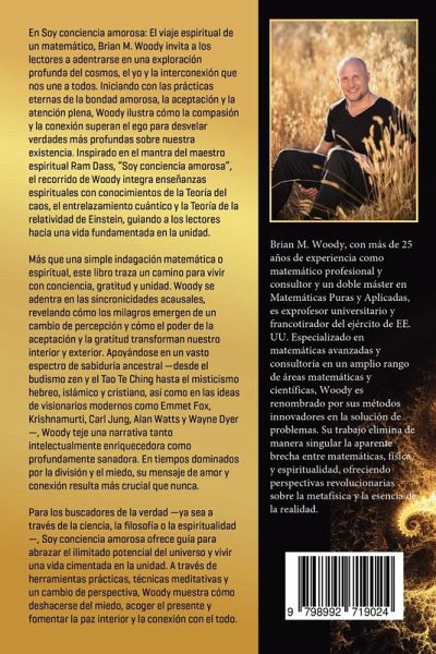 ¿ Ganador del International Impact Book Awards 2025 - Espiritualidad: Perspectivas espirituales - Otorgado a Brian M. Woody por I Am Loving Awareness: A Mathematician's Spiritual Journey - Soy conciencia amorosa, por su título en español. En Soy conciencia amorosa: El viaje espiritual de un matemático (I Am Loving Awareness, por su título en inglés), Brian M. Woody invita a los lectores a una exploración profunda del cosmos, el yo y la interconexión que nos une a todos. Comenzando con la bondad amorosa, la aceptación y la atención plena, Woody ilustra cómo la compasión y la conexión superan el ego para desvelar verdades más profundas sobre nuestra existencia. Inspirado en el mantra del maestro espiritual Ram Dass, "Soy conciencia amorosa", su recorrido integra enseñanzas espirituales con la Teoría del Caos, el entrelazamiento cuántico y la Teoría de la Relatividad de Einstein, guiando a los lectores hacia una vida fundamentada en la unidad. Más que una simple indagación matemática o espiritual, este libro traza un camino para vivir con conciencia, gratitud y unidad. Woody se adentra en las sincronicidades acausales, revelando cómo los milagros emergen de un cambio de percepción y cómo la aceptación y la gratitud transforman nuestro interior y exterior. Basándose en la sabiduría ancestral -del budismo zen, el Tao Te Ching y el misticismo hebreo, islámico y cristiano- y en las ideas de visionarios modernos como Emmet Fox, Krishnamurti, Carl Jung, Alan Watts y Wayne Dyer, Woody teje una narrativa intelectualmente enriquecedora y profundamente sanadora. En tiempos dominados por la división y el miedo, su mensaje de amor y conexión es más crucial que nunca. Para los buscadores de la verdad -ya sea a través de la ciencia, la filosofía o la espiritualidad-, Soy conciencia amorosa ofrece guía para abrazar el ilimitado potencial del universo y vivir en unidad. A través de herramientas prácticas, técnicas meditativas y un cambio de perspectiva, Woody muestra cómo liberarse del miedo, abrazar el presente y fomentar la paz interior y la conexión con el todo. Brian M. Woody, con más de 25 años de experiencia como matemático profesional y consultor, posee un doble máster en Matemáticas Puras y Aplicadas. Exprofesor universitario y exfrancotirador del ejército de EE. UU., se especializa en matemáticas avanzadas y consultoría en un amplio rango de áreas científicas. Conocido por sus enfoques innovadores, su trabajo disuelve la brecha entre matemáticas, física y espiritualidad, ofreciendo perspectivas transformadoras sobre la metafísica y la esencia de la realidad. ¿ Soy conciencia amorosa es un viaje transformador de conexión universal, que combina ciencia, espiritualidad y sabiduría atemporal para ayudarte a cultivar la paz interior y el potencial ilimitado. ¿¿ La ciencia de la unidad - Explora cómo la Teoría del Caos, el entrelazamiento cuántico y las ideas de Einstein se alinean con verdades espirituales, revelando la unidad del universo. ¿¿ Sabiduría atemporal - Inspírate en el budismo zen, el Tao Te Ching y tradiciones místicas de diversas culturas, junto con maestros modernos como Ram Dass y Krishnamurti. ¿¿ Herramientas prácticas para la transformación - Aprende prácticas meditativas, ejercicios de gratitud y herramientas para cambiar la percepción y crear armonía interior y exterior. ¿¿ Más allá del ego - Libera el miedo, el apego y las creencias limitantes mediante la atención plena, la bondad amorosa y la aceptación, promoviendo el despertar espiritual y el amor universal. ¿¿ Una guía para buscadores - Ya sea que te interese la ciencia, la filosofía o la espiritualidad, este libro ofrece una hoja de ruta clara hacia el despe