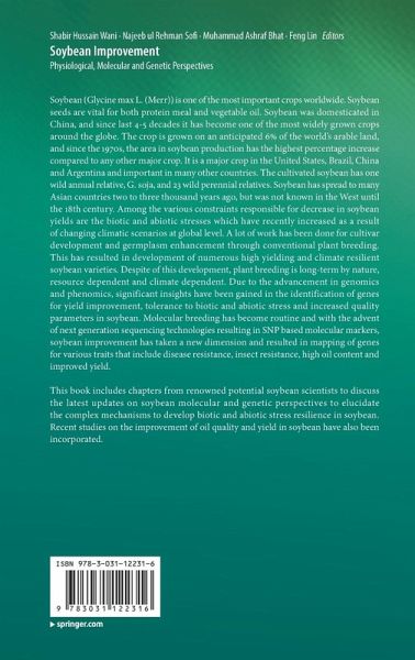 Soybean (Glycine max L. (Merr)) is one of the most important crops worldwide. Soybean seeds are vital for both protein meal and vegetable oil. Soybean was domesticated in China, and since last 4-5 decades it has become one of the most widely grown crops around the globe. The crop is grown on an anticipated 6% of the world's arable land, and since the 1970s, the area in soybean production has the highest percentage increase compared to any other major crop. It is a major crop in the United States, Brazil, China and Argentina and important in many other countries. The cultivated soybean has one wild annual relative, G. soja, and 23 wild perennial relatives. Soybean has spread to many Asian countries two to three thousand years ago, but was not known in the West until the 18th century. Among the various constraints responsible for decrease in soybean yields are the biotic and abiotic stresses which have recently increased as a result of changing climatic scenarios at global level. Alot of work has been done for cultivar development and germplasm enhancement through conventional plant breeding. This has resulted in development of numerous high yielding and climate resilient soybean varieties. Despite of this development, plant breeding is long-term by nature, resource dependent and climate dependent. Due to the advancement in genomics and phenomics, significant insights have been gained in the identification of genes for yield improvement, tolerance to biotic and abiotic stress and increased quality parameters in soybean. Molecular breeding has become routine and with the advent of next generation sequencing technologies resulting in SNP based molecular markers, soybean improvement has taken a new dimension and resulted in mapping of genes for various traits that include disease resistance, insect resistance, high oil content and improved yield. This book includes chapters from renowned potential soybean scientists to discuss the latest updates on soybean molecular and genetic perspectives to elucidate the complex mechanisms to develop biotic and abiotic stress resilience in soybean. Recent studies on the improvement of oil quality and yield in soybean have also been incorporated.