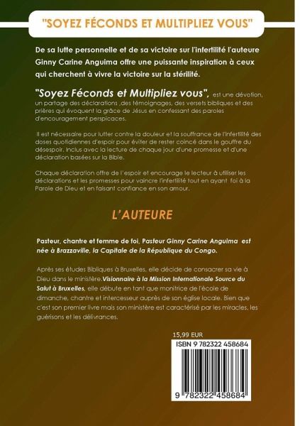 De sa lutte personnelle et de sa victoire sur l'infertilité l'auteur Ginny Carine Anguima offre une puissante inspiration à ceux qui cherchent à vivre la victoire sur la stérilité. "Soyez Féconds et Multipliez vous", est une dévotion, un partage des déclarations ,des témoignages, des versets bibliques et des prières qui évoquent la grâce de Jésus en confessant des paroles d'encouragement perspicaces. Il est nécessaire pour lutter contre la douleur et la souffrance de l'infertilité des doses quotidiennes d'espoir pour éviter de rester coincé dans le gouffre du désespoir. Inclus avec la lecture de chaque jour d'une promesse et d'une déclaration basées sur la Bible. Chaque déclaration offre de l espoir et encourage le lecteur à utiliser les déclarations et les promesses pour vaincre l'infertilité tout en ayant foi à la Parole de Dieu et en faisant confiance en son amour.