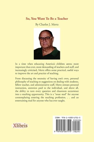 So,You Want To Be a Teacher By Charles J.Mertz In a time when educating America's children seems more important than ever, more demanding of teachers and staff, and increasingly criticized, Mertz offers some practical, useful ways to improve the art and practice of teaching. From discussing the necessity of having one's own, personal philosophy of teaching to suggestions on dealing with students, fellow teacher, and administrative staff, Mertz stresses personal interaction, attention paid to the individual, and above all, the ability to turn every question and classroom occurrence into a teaching opportunity. This is a "must read" for anyone contemplating entering the teaching profession. . . and an entertaining read for anyone who has ever taught.