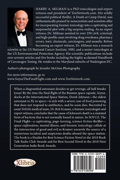 HARRY A. MILMAN is a PhD toxicologist and expert witness and president of ToxNetwork.com. His wildly successful political thriller, A Death at Camp David, was enthusiastically praised by nonscientists and scientists alike for incorporating forensic toxicology into a captivating and suspenseful plot with a big surprise ending. As an expert witness, Dr. Milman assisted in over 250 civil, criminal, and high-profi le cases involving drug overdoses, pharmacy errors, toxic chemicals, carcinogens, and assaults. Before becoming an expert witness, Dr. Milman was a research scientist at the US National Cancer Institute, NIH, and a senior toxicologist at the US Environmental Protection Agency. His scientifi c publications include over seventy articles and fi ve books including the highly acclaimed Handbook of Carcinogen Testing. He resides in the Maryland suburbs of Washington DC. Author's photograph by Jennifer McGinn Photography For more information, go to www.SoyuzTheFinalFlight.com and www.ToxNetwork.com.