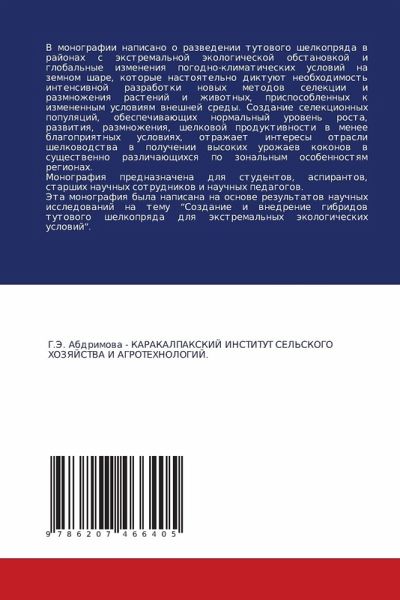 V monografii napisano o razwedenii tutowogo shelkoprqda w rajonah s äxtremal'noj äkologicheskoj obstanowkoj i global'nye izmeneniq pogodno-klimaticheskih uslowij na zemnom share, kotorye nastoqtel'no diktuüt neobhodimost' intensiwnoj razrabotki nowyh metodow selekcii i razmnozheniq rastenij i zhiwotnyh, prisposoblennyh k izmenennym uslowiqm wneshnej sredy. Sozdanie selekcionnyh populqcij, obespechiwaüschih normal'nyj urowen' rosta, razwitiq, razmnozheniq, shelkowoj produktiwnosti w menee blagopriqtnyh uslowiqh, otrazhaet interesy otrasli shelkowodstwa w poluchenii wysokih urozhaew kokonow w suschestwenno razlichaüschihsq po zonal'nym osobennostqm regionah. Monografiq prednaznachena dlq studentow, aspirantow, starshih nauchnyh sotrudnikow i nauchnyh pedagogow.Jeta monografiq byla napisana na osnowe rezul'tatow nauchnyh issledowanij na temu "Sozdanie i wnedrenie gibridow tutowogo shelkoprqda dlq äxtremal'nyh äkologicheskih uslowij".