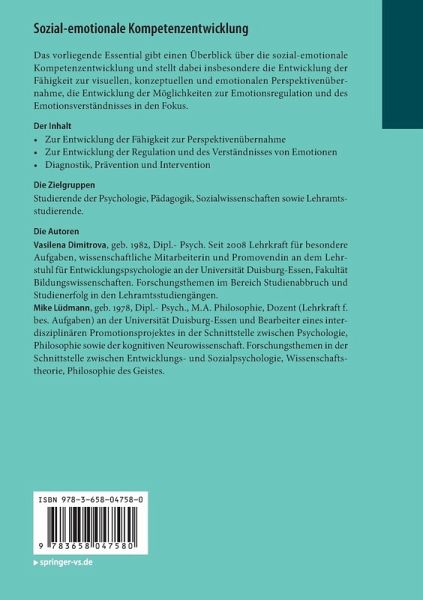 Das vorliegende Essential gibt einen Überblick über die sozial-emotionale Kompetenzentwicklung und stellt dabei insbesondere die Entwicklung der Fähigkeit zur visuellen, konzeptuellen und emotionalen Perspektivenübernahme, die Entwicklung der Möglichkeiten zur Emotionsregulation und des Emotionsverständnisses in den Fokus.