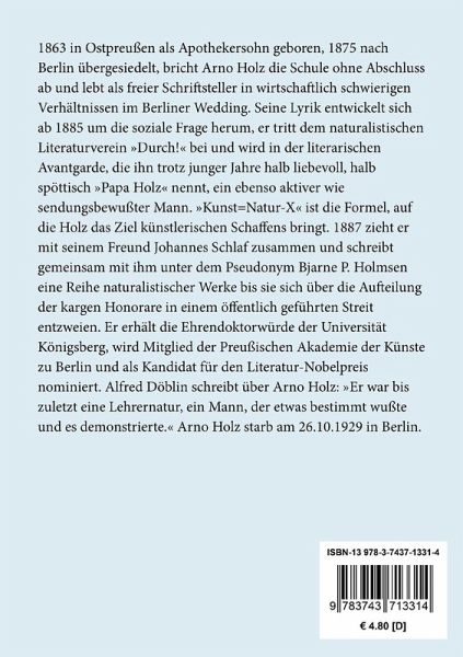1863 in Ostpreußen als Apothekersohn geboren, 1875 nach Berlin übergesiedelt, bricht Arno Holz die Schule ohne Abschluss ab und lebt als freier Schriftsteller in wirtschaftlich schwierigen Verhältnissen im Berliner Wedding. Seine Lyrik entwickelt sich ab 1885 um die soziale Frage herum, er tritt dem naturalistischen Literaturverein "Durch!" bei und wird in der literarischen Avantgarde, die ihn trotz junger Jahre halb liebevoll, halb spöttisch "Papa Holz" nennt, ein ebenso aktiver wie sendungsbewußter Mann. "Kunst=Natur-X" ist die Formel, auf die Holz das Ziel künstlerischen Schaffens bringt. 1887 zieht er mit seinem Freund Johannes Schlaf zusammen und schreibt gemeinsam mit ihm unter dem Pseudonym Bjarne P. Holmsen eine Reihe naturalistischer Werke bis sie sich über die Aufteilung der kargen Honorare in einem öffentlich geführten Streit entzweien. Er erhält die Ehrendoktorwürde der Universität Königsberg, wird Mitglied der Preußischen Akademie der Künste zu Berlin und als Kandidat für den Literatur-Nobelpreis nominiert. Alfred Döblin schreibt über Arno Holz: "Er war bis zuletzt eine Lehrernatur, ein Mann, der etwas bestimmt wußte und es demonstrierte." Arno Holz starb am 26.10.1929 in Berlin.