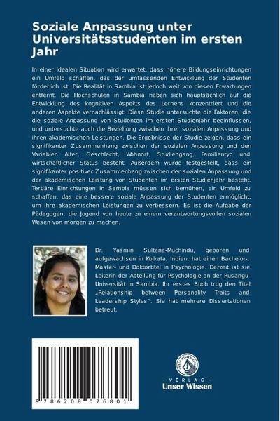 In einer idealen Situation wird erwartet, dass höhere Bildungseinrichtungen ein Umfeld schaffen, das der umfassenden Entwicklung der Studenten förderlich ist. Die Realität in Sambia ist jedoch weit von diesen Erwartungen entfernt. Die Hochschulen in Sambia haben sich hauptsächlich auf die Entwicklung des kognitiven Aspekts des Lernens konzentriert und die anderen Aspekte vernachlässigt. Diese Studie untersuchte die Faktoren, die die soziale Anpassung von Studenten im ersten Studienjahr beeinflussen, und untersuchte auch die Beziehung zwischen ihrer sozialen Anpassung und ihren akademischen Leistungen. Die Ergebnisse der Studie zeigen, dass ein signifikanter Zusammenhang zwischen der sozialen Anpassung und den Variablen Alter, Geschlecht, Wohnort, Studiengang, Familientyp und wirtschaftlicher Status besteht. Außerdem wurde festgestellt, dass ein signifikanter positiver Zusammenhang zwischen der sozialen Anpassung und der akademischen Leistung von Studenten im ersten Studienjahr besteht. Tertiäre Einrichtungen in Sambia müssen sich bemühen, ein Umfeld zu schaffen, das eine bessere soziale Anpassung der Studenten ermöglicht, um ihre akademischen Leistungen zu verbessern. Es ist die Aufgabe der Pädagogen, die Jugend von heute zu einem verantwortungsvollen sozialen Wesen von morgen zu machen.