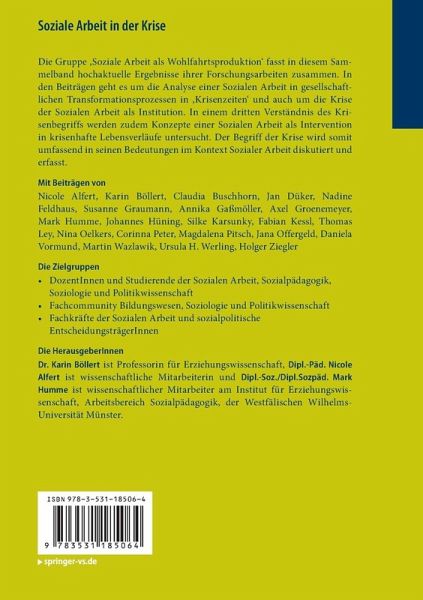 Die Gruppe 'Soziale Arbeit als Wohlfahrtsproduktion' fasst in diesem Sammelband hochaktuelle Ergebnisse ihrer Forschungsarbeiten zusammen. In den Beiträgen geht es um die Analyse einer Sozialen Arbeit in gesellschaftlichen Transformationsprozessen in 'Krisenzeiten' und auch um die Krise der Sozialen Arbeit als Institution. In einem dritten Verständnis des Krisenbegriffs werden zudem Konzepte einer Sozialen Arbeit als Intervention in krisenhafte Lebensverläufe untersucht. Der Begriff der Krise wird somit umfassend in seinen Bedeutungen im Kontext Sozialer Arbeit diskutiert und erfasst.