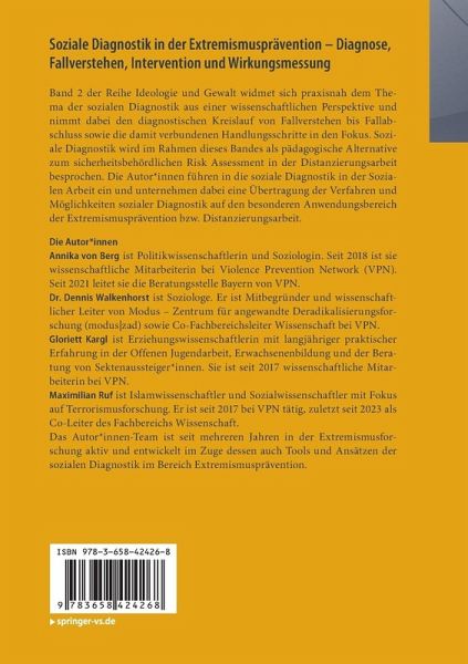 Annika von Berg ist Politikwissenschaftlerin und Soziologin. Seit 2018 ist sie wissenschaftliche Mitarbeiterin bei Violence Prevention Network (VPN). Seit 2021 leitet sie die Beratungsstelle Bayern von VPN. Dr. Dennis Walkenhorst ist Soziologe und Professor für Soziale Arbeit an der IU Internationale Hochschule in Leipzig. Gloriett Kargl ist Erziehungswissenschaftlerin mit langjähriger praktischer Erfahrung in der Offenen Jugendarbeit, Erwachsenenbildung und der Beratung von Sektenaussteiger*innen. Sie ist seit 2017 wissenschaftliche Mitarbeiterin bei VPN. Maximilian Ruf ist Islamwissenschaftler und Sozialwissenschaftler mit Fokus auf Terrorismusforschung. Er ist seit 2017 bei VPN tätig, zuletzt seit 2023 als Co-Leiter des Fachbereichs Wissenschaft. Das Autor*innen-Team ist seit mehreren Jahren in der Extremismusforschung aktiv und entwickelt im Zuge dessen auch Tools und Ansätzen der sozialen Diagnostikim Bereich Extremismusprävention. er mit Fokus auf Terrorismusforschung. Er ist seit 2017 bei VPN tätig, zuletzt seit 2023 als Co-Leiter des Fachbereichs Wissenschaft. Das Autor*innen-Team ist seit mehreren Jahren in der Extremismusforschung aktiv und entwickelt im Zuge dessen auch Tools und Ansätzen der sozialen Diagnostik im Bereich Extremismusprävention.