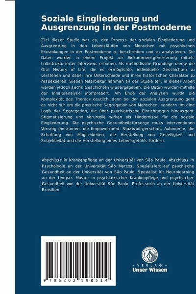 Ziel dieser Studie war es, den Prozess der sozialen Eingliederung und Ausgrenzung in den Lebensläufen von Menschen mit psychischen Erkrankungen in der Postmoderne zu beschreiben und zu analysieren. Die Daten wurden in einem Projekt zur Einkommensgenerierung mittels halbstrukturierter Interviews erhoben. Als methodische Grundlage diente die Oral History of Life, die es ermöglichte, individuelle Geschichten zu verstehen und dabei ihre Unterschiede und ihren historischen Charakter zu respektieren. Sieben Mitarbeiter nahmen an der Studie teil, in dieser Arbeit werden jedoch sechs Geschichten wiedergegeben. Die Daten wurden mithilfe der Inhaltsanalyse interpretiert. Am Ende der Analysen wurde die Komplexität des Themas deutlich, denn bei der sozialen Ausgrenzung geht es nicht nur um die physische Segregation von Menschen, sondern um eine Logik der Segregation, die über psychiatrische Einrichtungen hinausgeht. Stigmatisierung und Vorurteile wirken als Hindernisse für die soziale Eingliederung. Die psychische Gesundheitsfürsorge muss Interventionen Vorrang einräumen, die Empowerment, Staatsbürgerschaft, Autonomie, die Schaffung von Möglichkeiten, die Herstellung von Geselligkeit und Subjektivität und die Herstellung eines Lebensgefühls fördern.