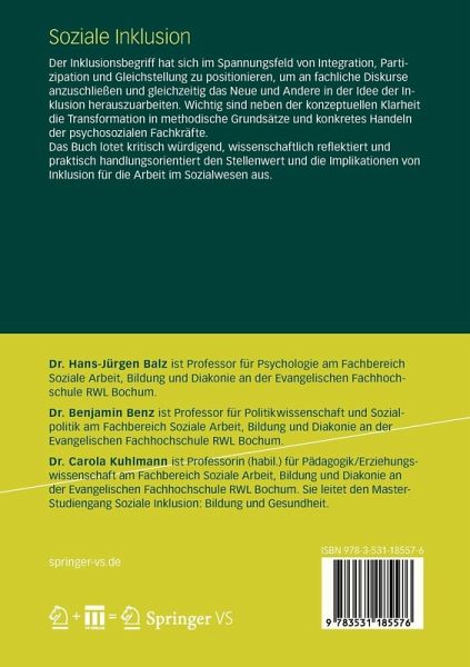 Dr. Hans-Jürgen Balz ist Professor für Psychologie am Fachbereich Soziale Arbeit, Bildung und Diakonie an der Evangelischen Fachhochschule RWL Bochum. Dr. Benjamin Benz ist Professor für Politikwissenschaft und Sozialpolitik am Fachbereich Soziale Arbeit, Bildung und Diakonie an der Evangelischen Fachhochschule RWL Bochum. Dr. Carola Kuhlmann ist Professorin (habil.) für Pädagogik/Erziehungswissenschaft am Fachbereich Soziale Arbeit, Bildung und Diakonie an der Evangelischen Fachhochschule RWL Bochum. Sie leitet den Master-Studiengang Soziale Inklusion: Bildung und Gesundheit.