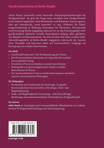 Anika Noack untersucht sozial innovative Handlungsorientierungen der Zivilgesellschaft. Sie geht der Frage nach, inwiefern sich Zivilgesellschaft heute dadurch legitimiert, über Bestehendes und Bekanntes hinauszugehen, oder gar beansprucht, sozial innovativ zu sein. Während die Handlungsorientierung in Richtung Innovation für Ökonomie, Wissenschaft und Forschung bereits langjährig erforscht ist, ist das Forschungsfeld zivilgesellschaftlich initiierter sozialer Innovationen bislang offen geblieben. Am Beispiel von Raumpionieren, die sich auf dem Feld einer sozialen Stadtentwicklungspolitik in Berlin-Moabit engagieren, untersucht die Autorin diese Thematik und fokussiert dabei auf kommunikative Vorgänge zur Erzeugung von sozialen Innovationen.