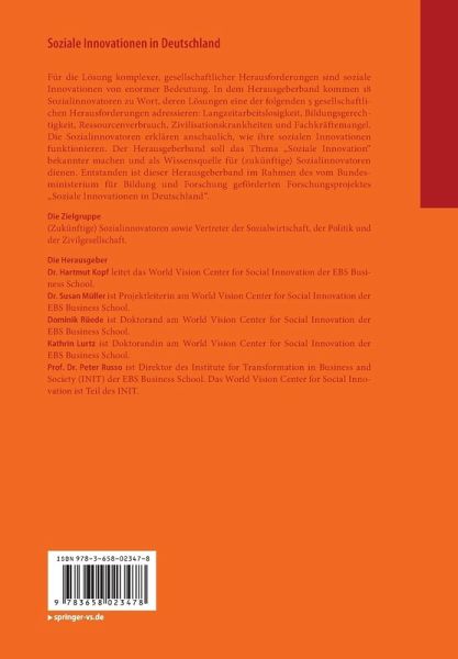 Für die Lösung komplexer, gesellschaftlicher Herausforderungen sind soziale Innovationen von enormer Bedeutung. In dem Herausgeberband kommen 18 Sozialinnovatoren zu Wort, deren Lösungen eine der folgenden 5 gesellschaftlichen Herausforderungen adressieren: Langzeitarbeitslosigkeit, Bildungsgerechtigkeit, Ressourcenverbrauch, Zivilisationskrankheiten und Fachkräftemangel. Die Sozialinnovatoren erklären anschaulich, wie ihre sozialen Innovationen funktionieren. Der Herausgeberband soll das Thema "Soziale Innovation" bekannter machen und als Wissensquelle für (zukünftige) Sozialinnovatoren dienen. Entstanden ist dieser Herausgeberband im Rahmen des vom Bundesministerium für Bildung und Forschung geförderten Forschungsprojektes "Soziale Innovationen in Deutschland".
