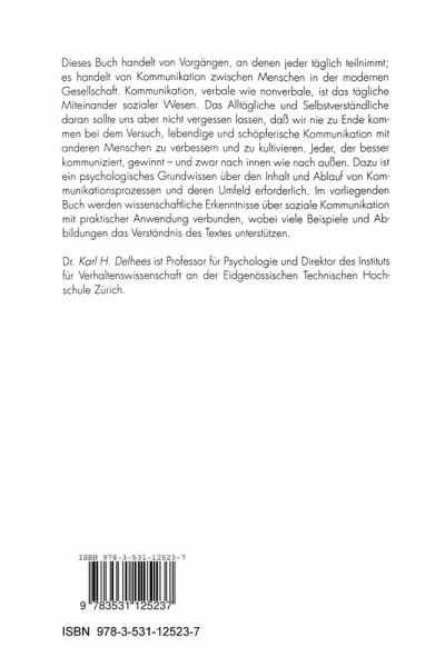 1 Was ist soziale Kommunikation?.- 1.1 Begriffe und Gegenstand.- 1.2 Eine Logik der Kommunikation.- 1.3 Reziprozität, Gegenseitigkeit.- 1.4 Kommunikation als Multikanal-Multikodesystem.- 1.5 Funktionen der Kommunikation.- 1.6 Synchronisierung, Koordination.- 1.7 Metakommunikation.- 2 Das Selbst in der sozialen Kommunikation.- 2.1 Was ist das Selbst?.- 2.2 Öffentliches und privates Selbstkonzept.- 2.3 Selbstdarstellung im Alltag.- 2.4 Selbstwertgefühl.- 2.5 Soziale Angst.- 2.6 Äußerungsformen selbstsicheren Verhaltens.- 2.7 Selbstverständnis und Rollenverhalten.- 2.8 Verbesserung des Selbst- und Fremdverständnisses durch Feedback.- 3 Personwahrnehmung oder das Bild vom andern.- 3.1 Perspektiven der Personwahrnehmung: Kognition und Interaktion.- 3.2 Unterschiede in der Wahrnehmung von Personen und Objekten.- 3.3 Wahrnehmung und Wirklichkeit.- 3.4 Der Prozeß der Personwahrnehmung.- 3.5 Personwahrnehmung im Vorstellungsgespräch - ein Praxisbeispiel.- 4 Nonverbale Kommunikation.- 4.1 Verbale und nonverbale Kommunikation im Vergleich.- 4.2 Funktionen der nonverbalen Kommunikation.- 4.3 "Mikro-Aspekte": das einzelne nonverbale Signal.- 4.4 Kulturelle Unterschiede.- 4.5 Enkodierung und Dekodierung der Körpersprache.- 5 Symbolische Kommunikation.- 5.1 Was sind Symbole?.- 5.2 Symbolsysteme.- 5.3 Symbolfunktionen.- 5.4 Die Bedeutungsvielfalt von Symbolen und Symbolsystemen.- 5.5 Symbolische Führung - ein Praxisbeispiel.- 6 Redekommunikation.- 6.1 Die Bedeutung der Sprache für die Kommunikation.- 6.2 Sprache bei Tieren?.- 6.3 Die Benennung von Objekten, Personen und Ereignissen.- 6.4 Die Wahl der Worte.- 6.5 Sprache als Spiegel der Persönlichkeit.- 6.6 Sprech- und Redeformen.- 6.7 Der Niedergang des Wortes.- 7 Zuhörkommunikation.- 7.1 Gründe für schlechtesZuhören.- 7.2 Regeln für effektives Zuhören.- 7.3 Aufmerksamkeit und Konzentration.- 7.4 Aufmerksamkeit und Konzentration beim Lernen.- 7.5 Anzeichen des Zuhörens.- 7.6 Von der Aufmerksamkeit zum Verstehen.- 7.7 Vorgehensweisen des Verstehens.- 7.8 Empathisches oder einfühlendes Zuhören.- 8 Informationsverarbeitung und Informationsspeicherung.- 8.1 Vorstellungen über das menschliche Gedächtnis.- 8.2 Kapazitätsgrenzen oder die magische Zahl Sieben, plus oder minus zwei.- 8.3 Enkodierungsprozesse.- 8.4 Verschiedene Enkodierungssysteme.- 8.5 Wissensbestand.- 8.6 Methoden der Ideenfindung.- 9 Störungen und Konflikte.- 9.1 Gestörte Kommunikationen.- 9.2 Paradoxe Kommunikation.- 9.3 Unfähigkeit zur Metakommunikation.- 9.4 Konfliktgeschehen.- 9.5 Konfliktursachen.- 9.6 Konfliktentstehung.- 9.7 Konfliktaustragung.- 9.8 Konfliktbewältigung.- 9.9 Abwehrverhalten.- 9.10 Konfliktnachwirkungen.- 9.11 Umgang mit Konflikten: eine Zusammenfassung.- 10 Die Gruppe als Kommunikationssystem.- 10.1 Besonderheiten von Gruppen.- 10.2 Besonderheiten von Arbeitsgruppen in wirtschaftlichen Organisationen.- 10.3 Kommunikationsmuster.- 10.4 Sozialisation in der Gruppe.- 10.5 Konformität und Kreativität.- 10.6 Zusammenarbeit in Gruppen.- 10.7 Gruppenbedingte Fehleinschätzung (groupthink).- 11 Schlußbemerkungen.- Namensverzeichnis.