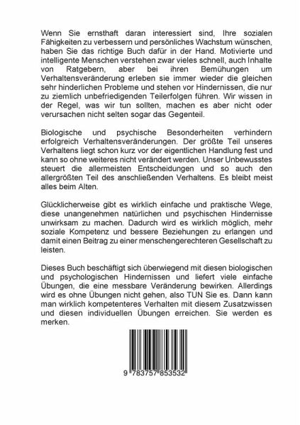 Wenn Sie ernsthaft daran interessiert sind, Ihre sozialen Fähigkeiten zu verbessern und persönliches Wachstum wünschen, haben Sie das richtige Buch dafür in der Hand. Motivierte und intelligente Menschen verstehen zwar vieles schnell, auch Inhalte von Ratgebern, aber bei ihren Bemühungen um Verhaltensveränderung erleben sie immer wieder die gleichen sehr hinderlichen Probleme und stehen vor Hindernissen, die nur zu ziemlich unbefriedigenden Teilerfolgen führen. Wir wissen in der Regel, was wir tun sollten, machen es aber nicht oder verursachen nicht selten sogar das Gegenteil. Biologische und psychische Besonderheiten verhindern erfolgreich Verhaltensveränderungen. Der größte Teil unseres Verhaltens liegt schon kurz vor der eigentlichen Handlung fest und kann so ohne weiteres nicht verändert werden. Unser Unbewusstes steuert die allermeisten Entscheidungen und so auch den allergrößten Teil des anschließenden Verhaltens. Es bleibt meist alles beim Alten.Glücklicherweise gibt es wirklich einfache und praktische Wege, diese unangenehmen natürlichen und psychischen Hindernisse unwirksam zu machen. Dadurch wird es wirklich möglich, mehr soziale Kompetenz und bessere Beziehungen zu erlangen und damit einen Beitrag zu einer menschengerechteren Gesellschaft zu leisten. Dieses Buch beschäftigt sich überwiegend mit diesen biologischen und psychologischen Hindernissen und liefert viele einfache Übungen, die eine messbare Veränderung bewirken. Allerdings wird es ohne Übungen nicht gehen, also TUN Sie es. Dann kann man wirklich kompetenteres Verhalten mit diesem Zusatzwissen und diesen individuellen Übungen erreichen. Sie werden es merken.