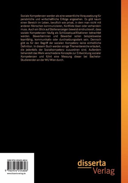 Soziale Kompetenzen werden als eine wesentliche Voraussetzung für persönliche und wirtschaftliche Erfolge angesehen. Es gibt kaum einen Bereich im Leben, beruflich wie privat, in dem man nicht mit anderen Menschen kommunizieren, Konflikte lösen oder verhandeln muss. Auch ein Blick auf Stellenanzeigen beweist eindrucksvoll, dass soziale Kompetenzen häufig als Schlüsselqualifikationen betrachtet werden. Bewerberinnen und Bewerber sollen beispielsweise teamfähig, kommunikativ oder durchsetzungsstark sein. Dennoch gibt es für den Begriff der sozialen Kompetenz keine einheitliche Definition. In diesem Buch werden einige Themenbereiche erläutert, die jedenfalls der Sozialkompetenz zuzuordnen sind. Außerdem behandelt das Werk verschiedene Konzepte zur Entwicklung sozialer Kompetenzen und führt eine Messung dieser bei Bachelor-Studierenden an der WU Wien durch.