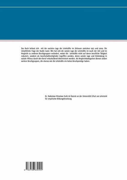 Die vorliegende Schrift befasst sich mit der sozialen Lage der Lehrkräfte im Zeitraum zwischen 1973 und 2009. Die inhaltliche Frage der Studie lautet: Wie hat sich die soziale Lage der Lehrkräfte im Laufe der Zeit und im Vergleich zu anderen Berufsgruppen verändert, wobei das Augenmerk der Analyse sich auf die Merkmale richtet über die alle erwerbstätigen Gesellschaftsmitglieder verfügen und miteinander verglichen werden können. Die Analyse der sozialen Lage bedeutet, dass die Lehrkräfte nicht auf deren berufliche Tätigkeit reduziert, sondern als gesellschaftliche Mitglieder begriffen werden, deren soziale Lage und Einbindung in soziale Milieus durch den Beruf entscheidend de-terminiert werden. Als Vergleichskategorien dienen sieben weitere Berufsgruppen, die ebenso wie die Lehrkräfte ein hohes Berufsprestige haben. Die Studie hat ein Trenddesign und verwendet Sekundärdaten des Mikrozensus Scienti-fic-Use-File aus den Jahren 1973, 1982, 1991 und 2009.
