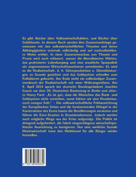 Es gibt Bücher über Volkswirtschaftslehre, und Bücher über Geldtheorie. In diesem Buch werden ihre Zusammenhänge gemeinsam mit den volkswirtschaftlichen Theorien und deren Abhängigkeiten erstmals vollständig und auf nachvollziehbare Weise erklärt. In einer Zusammenschau von Theorie und Praxis wird auch erläutert, warum die liberalisierten Märkte, das praktizierte Lohndumping und eine staatliche Sparpolitik ein angemessenes Wirtschaftswachstum unterbinden. Es wird so die Realwirtschaft, d. h. Güterproduktion u. Dienstleistungen zu Grunde gerichtet und das Geldsystem schneller zum Kollabieren gebracht. Am Ende steht ein vollständiger Zusammenbruch der Realwirtschaft mit einer Währungsreform. Am 9. April 2014 sprach der deutsche Bundespräsident Joachim Gauck vor dem 20. Deutschen Bankentag in Berlin und zitierte Henry Ford: "Es ist gut, dass die Menschen das Bank- und Geldsystem nicht verstehen, sonst hätten wir eine Revolution, noch morgen früh." - Die volkswirtschaftliche Fehlausrichtung der Europäischen Union und die fundamentalen Mängel in der Konstruktion des Euros lassen die Bevölkerungen verarmen und führen die Euro-Staaten in Staatsinsolvenzen. Jedoch werden auch mögliche Wege aus der Krise aufgezeigt. Die Politik ist dringend aufgefordert, die falsch eingeschlagene wirtschaftspolitische Ausrichtung zu korrigieren. Nur eine wirkliche Soziale Marktwirtschaft kann den Wohlstand für alle Bürger wieder herstellen.