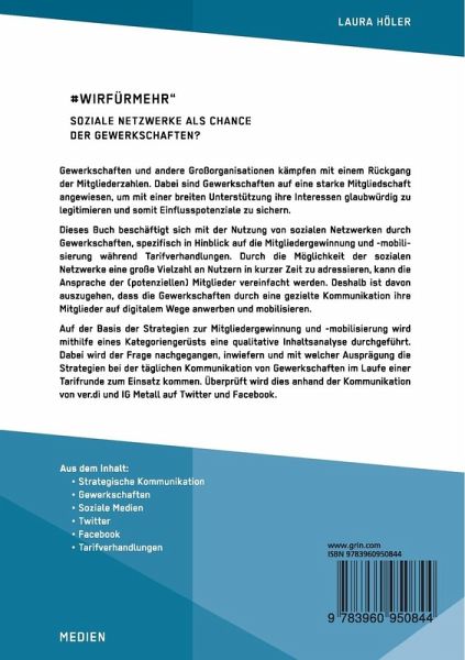 Gewerkschaften und andere Großorganisationen kämpfen mit einem Rückgang der Mitgliederzahlen. Dabei sind Gewerkschaften auf eine starke Mitgliedschaft angewiesen, um mit einer breiten Unterstützung ihre Interessen glaubwürdig zu legitimieren und somit Einflusspotenziale zu sichern. Dieses Buch beschäftigt sich mit der Nutzung von sozialen Netzwerken durch Gewerkschaften, spezifisch in Hinblick auf die Mitgliedergewinnung und -mobilisierung während Tarifverhandlungen. Durch die Möglichkeit der sozialen Netzwerke eine große Vielzahl an Nutzern in kurzer Zeit zu adressieren, kann die Ansprache der (potenziellen) Mitglieder vereinfacht werden. Deshalb ist davon auszugehen, dass die Gewerkschaften durch eine gezielte Kommunikation ihre Mitglieder auf digitalem Wege anwerben und mobilisieren. Auf der Basis der Strategien zur Mitgliedergewinnung und -mobilisierung wird mithilfe eines Kategoriengerüsts eine qualitative Inhaltsanalyse durchgeführt. Dabei wird der Frage nachgegangen, inwiefern und mit welcher Ausprägung die Strategien bei der täglichen Kommunikation von Gewerkschaften im Laufe einer Tarifrunde zum Einsatz kommen. Überprüft wird dies anhand der Kommunikation von ver.di und IG Metall auf Twitter und Facebook. Aus dem Inhalt: - Strategische Kommunikation;- Gewerkschaften;- Soziale Medien;- Twitter;- Facebook;- Tarifverhandlungen